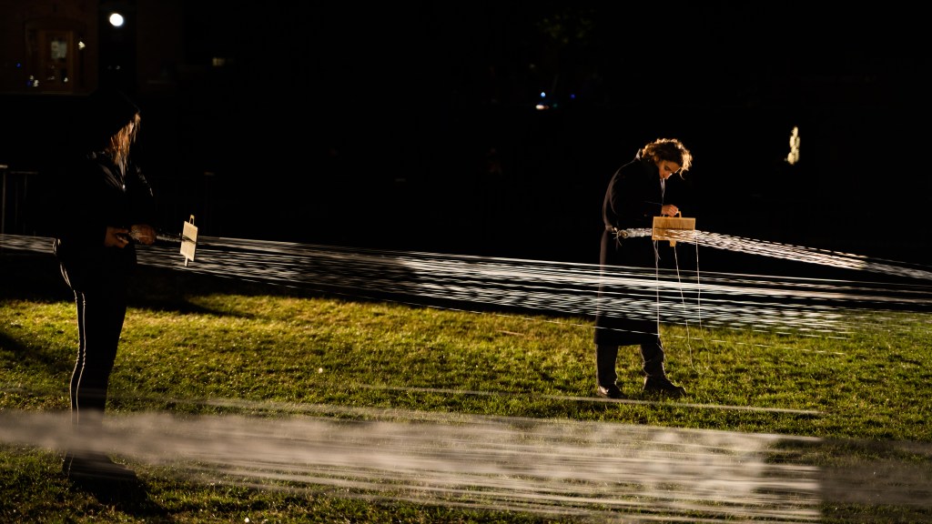 At Nuit Blanche 2022, Soft Walls Collective performed a live weaving event from 7 PM to 7 AM. Dozens of textile artists worked on a large textile piece, using reflective thread and hand-held looms.