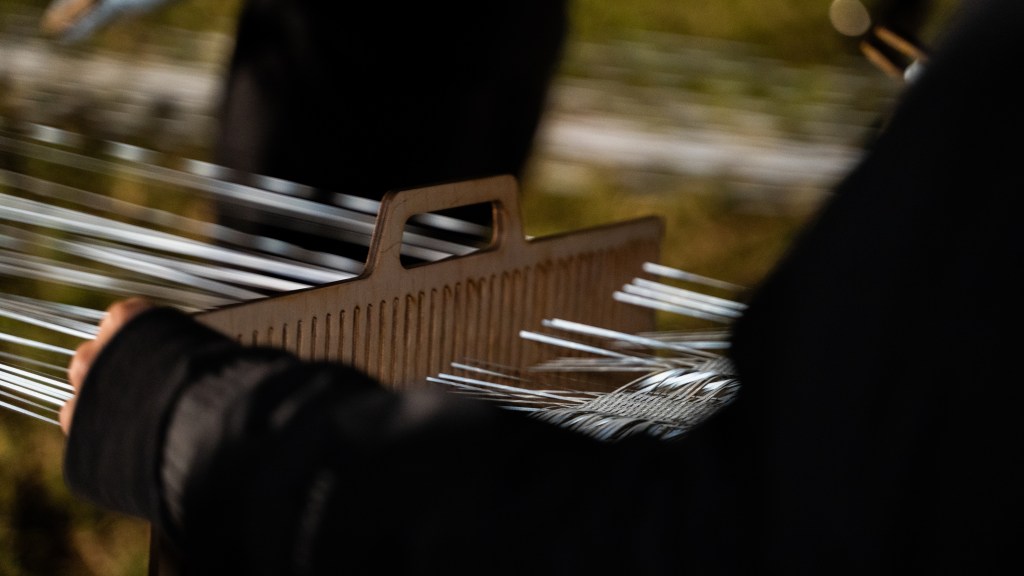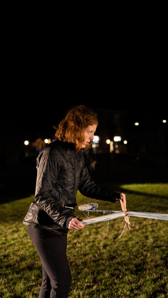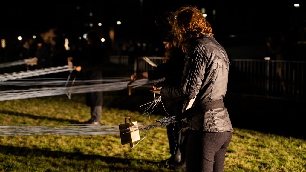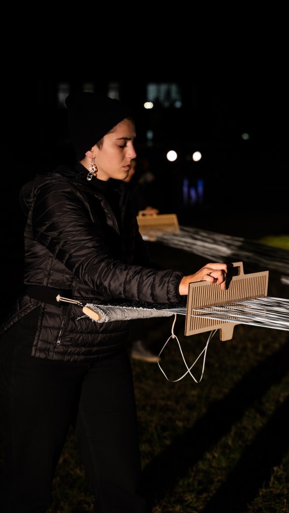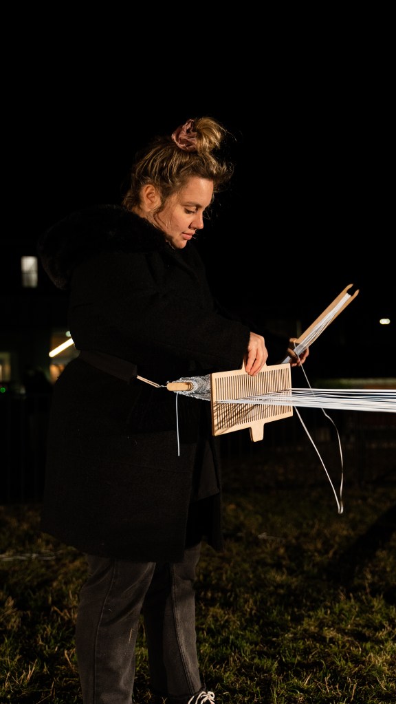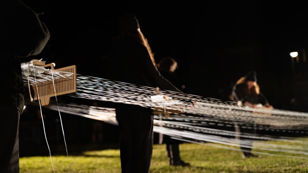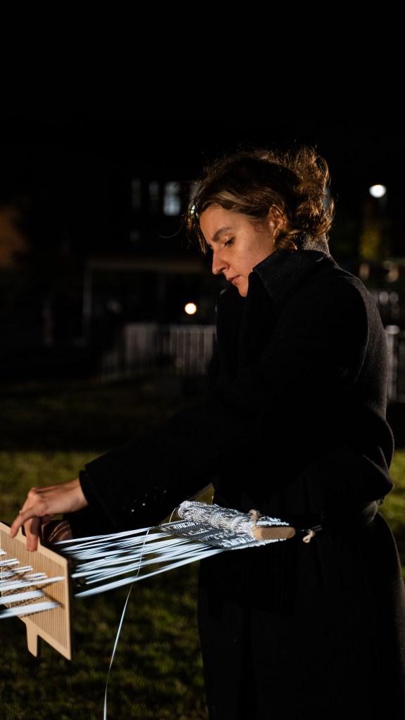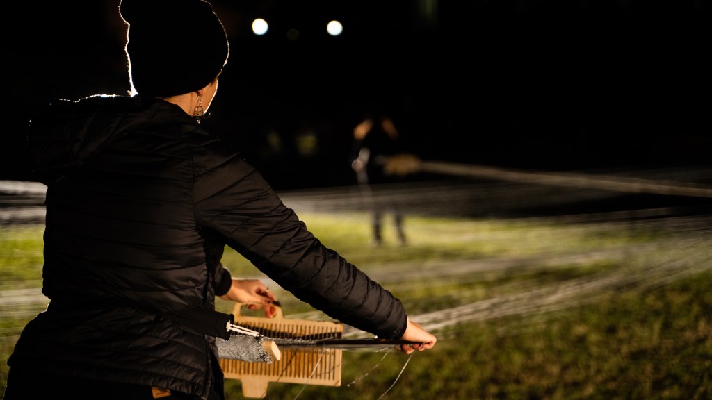 The Soft Walls Collective is a textile arts group that experiments with various weaving techniques. They performed a live weaving event during Nuit Blanche 2022 and commissioned dozens of textile artists to simultaneously weave a textile piece using reflective thread and hand-held looms.
